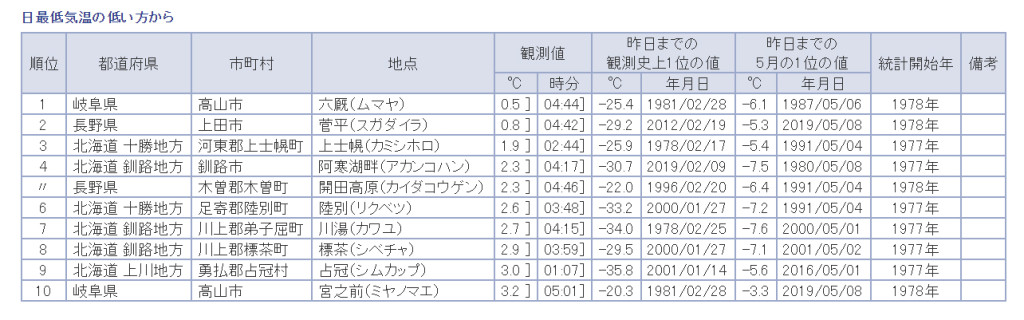 日本自然発酵の研究所がある、岐阜県高山市荘川町六厩の2021年5月26日の最低気温が0.5度となり、日本一の最低気温を記録しました。